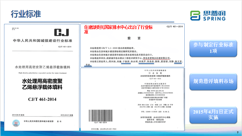 为规范悬浮填料市场,2014年思普润受邀参与了《水处理用高密度聚乙烯悬浮载体填料》(CJ/T461-2014)的编制。